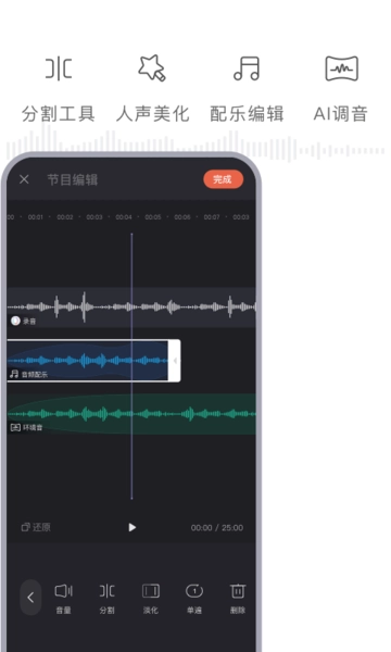 进入节目编辑界面后,可开展音频剪辑等相关操作,该界面配备声音美化功能,编辑工作结束后,点击完成按钮即可保存内容。