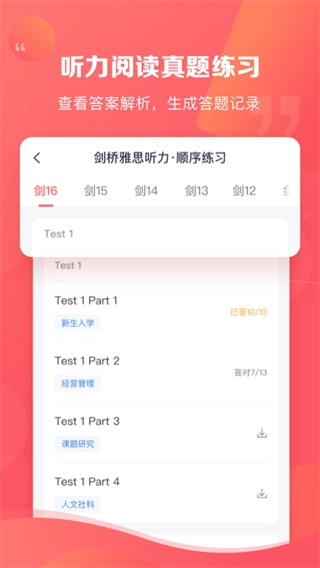 经剑桥大学出版社独家授权,这里提供剑5至剑17的全真听、读、说、写测试内容。您可随时免费进行练习。