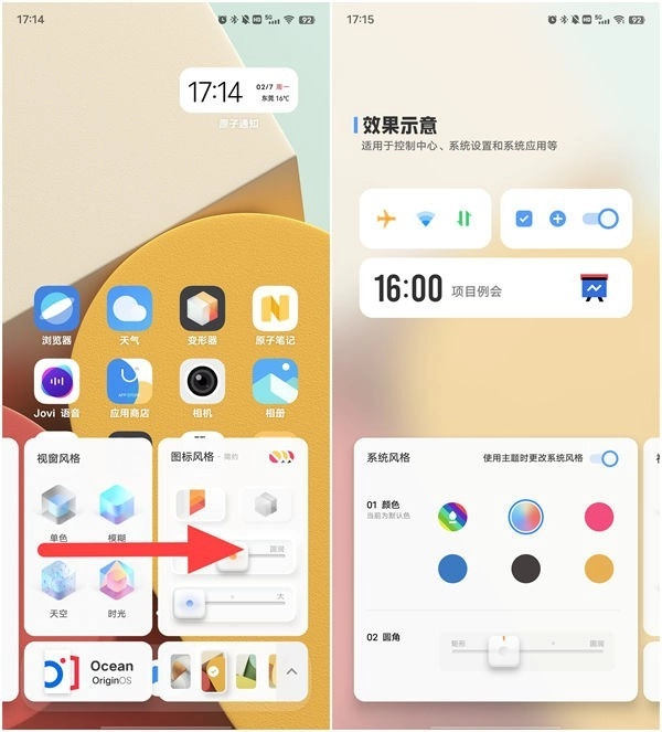 当开启“使用主题时更改系统风格”这一选项后,系统会自动适配当前主题的色彩与圆角样式;若关闭该选项,则系统风格不会随主题变化而调整。