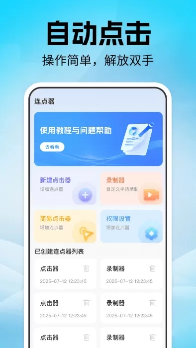 最新版点击器自动连点,是一款极为实用的自动点击软件,它专门针对那些需要频繁点击的场景而打造。借助这款软件,你的手指能够得以放松,与此同时,操作依旧可以维持高效与精准。它具备自动点击、连点以及手势操作等多样功能,还支持自动定时任务。并且,无需获取root权限,只要打开即可使用。