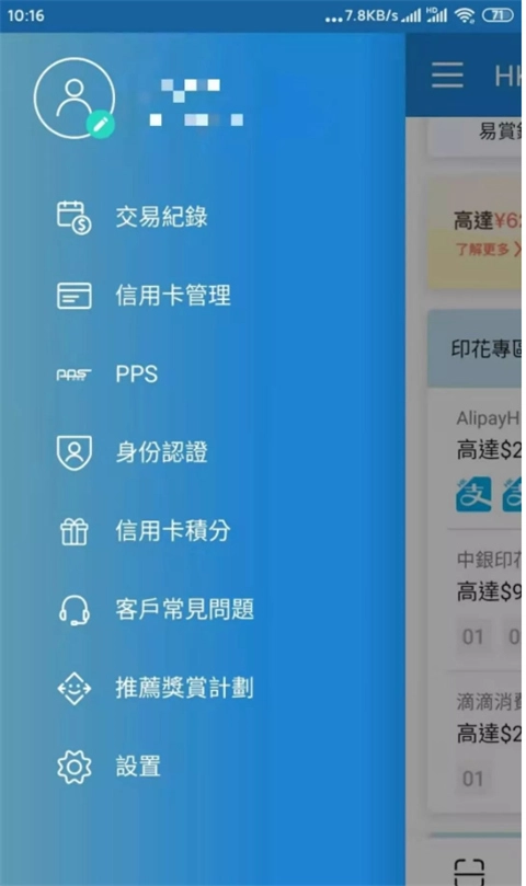 点击左上角的三条横线,打开相应界面后,就能查看交易记录、信用卡管理、PPS、身份认证、设置等功能了。
