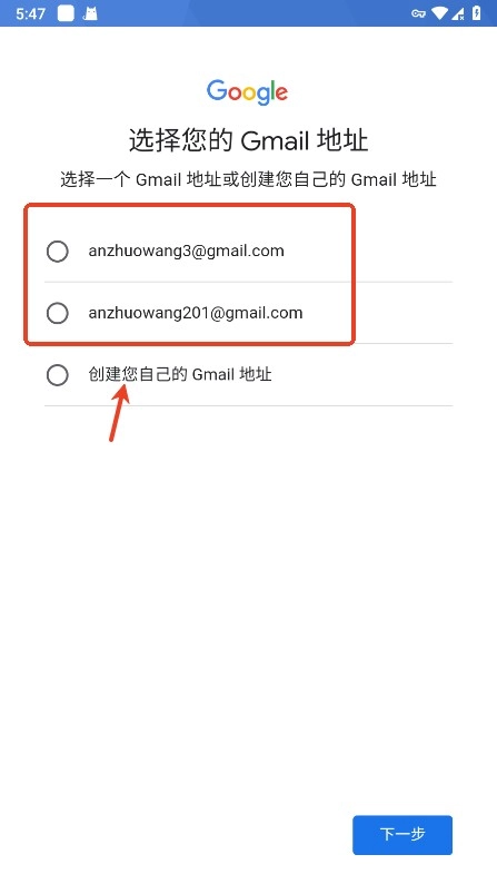 系统会推荐两个谷歌邮箱地址,你也可以点击最下方的自定义选项。