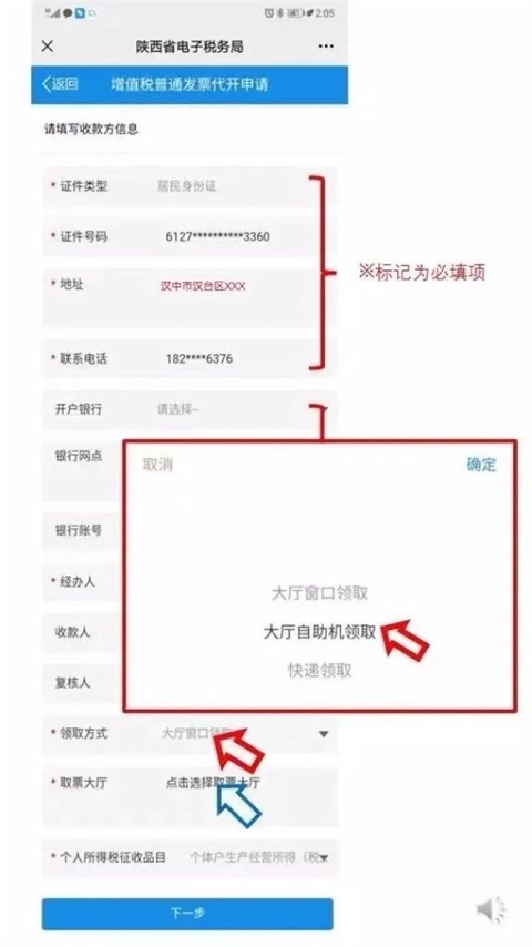 在填写完收款方的相关信息后,接下来需要选择取票方式。具体操作是点击取票方式选项右侧的下拉菜单,从中选择“大厅自助机领取”或“快递领取”这两种方式之一。需要说明的是,当前通过邮寄方式获取发票是不收取费用的。