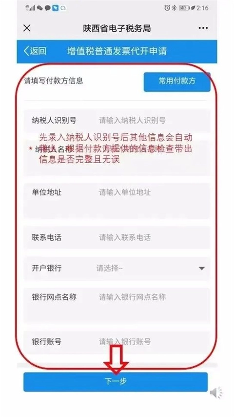 当前界面需填写付款方信息,先输入纳税人识别号,系统会自动带出其他相关信息,之后依据付款方提供的资料核对带出内容是否完整准确,确认无误后点击下方“下一步”按钮。