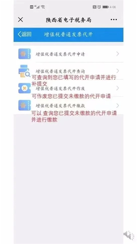 回到增值税普通发票代开主界面后,您可通过第二项“增值税普通发票代开查询”功能,查看一定时期内开具的发票信息,也能对已填写但未提交的代开申请进行补提交操作;第三项“增值税普通发票代开作废”功能,可用于作废已提交但尚未缴款的代开申请;第四项“增值税普通发票代开缴款”功能,则支持查询已提交未缴款的代开申请并完成缴款流程。