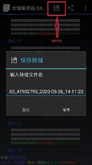 这时,卡片信息已成功读取,您可点击右上方按钮将其存储至本地。读取时若因卡片接触不良导致部分扇区信息缺失,可通过再次读取解决。存储的文件可通过主界面的“编辑/分析转储文件”功能打开。