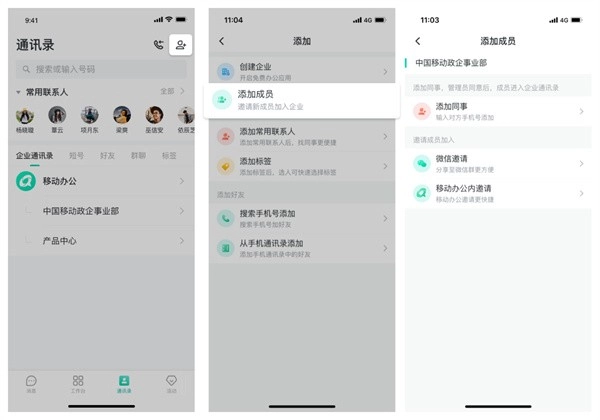 成功加入企业后,你可以依次点击通讯录、右上角的添加按钮、添加成员,选定企业后,就能借助微信邀请、移动办公内邀请等途径分享邀请链接。