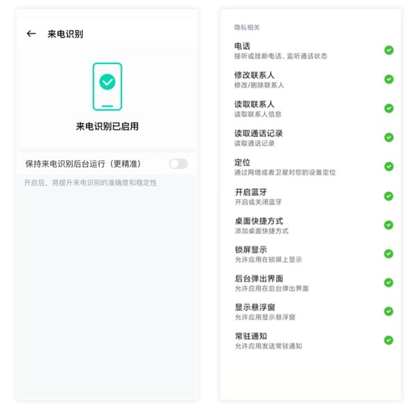 ——开启相关权限后,来电识别可以正常使用。