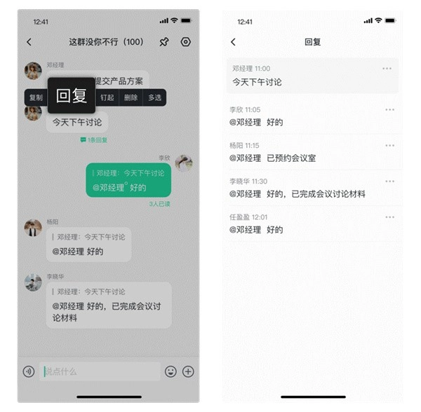 使用路径:长按消息气泡后选择【回复】选项,接着在输入框中输入回复内容并发送,最后点击原文消息下方的回复数即可进入回复详情页。