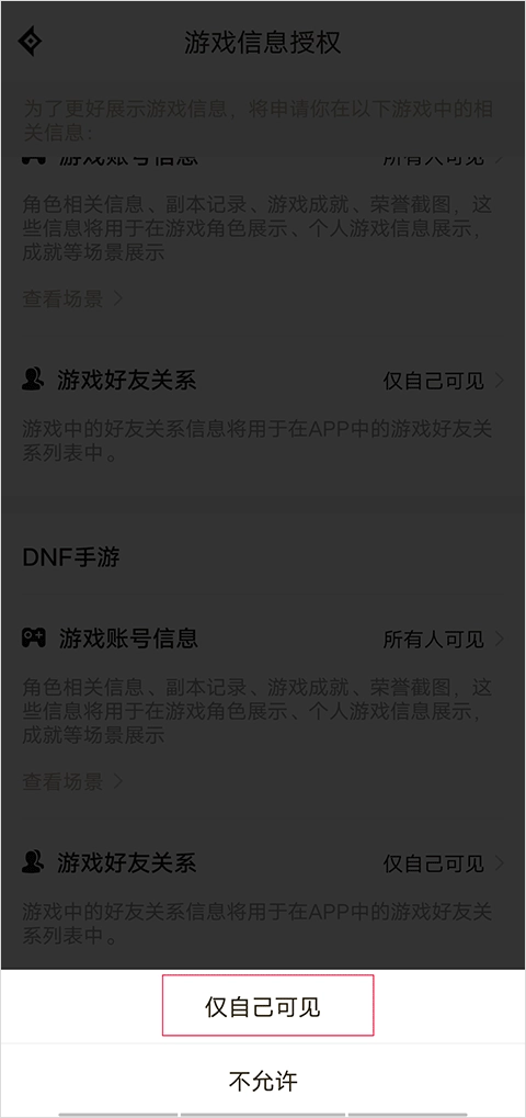 进入游戏信息授权界面后,点击游戏账号信息右侧的“所有人可见”选项。