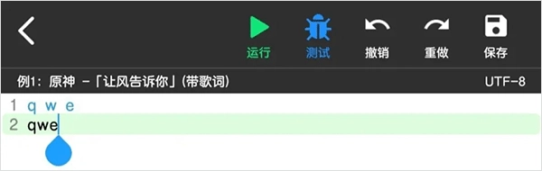 菜菜音乐盒配备了两种弹琴脚本的测试方式,其中“运行”功能对应播放完整的脚本内容,“测试”功能则用于播放左侧序号带有蓝色标记的单行或多行脚本。