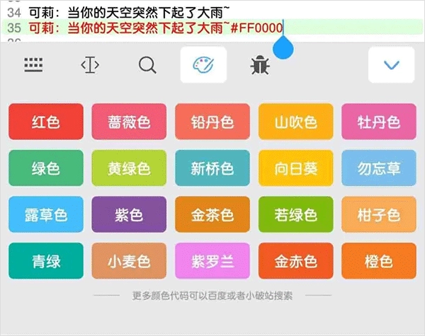 音乐盒了20种常用的颜色代码,操作很简单:把光标移到歌词最右侧点击,再点一下对应的颜色块,就能快速给歌词染上颜色了。