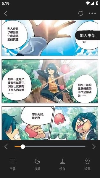 下面这张图展示的就是看漫画的界面,操作方式为上下滑动;点击界面后,还能进行目录选择、切换夜间模式、缓存漫画以及调整设置等操作。