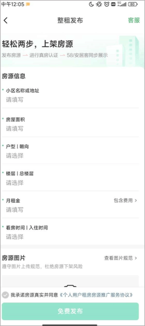 您只需输入租房相关信息,依次填写小区名称或具体地址、房屋的面积大小、户型与朝向情况、所在楼层、每月租金金额、可供看房的时间,以及上传房源图片,就能完成发布了。