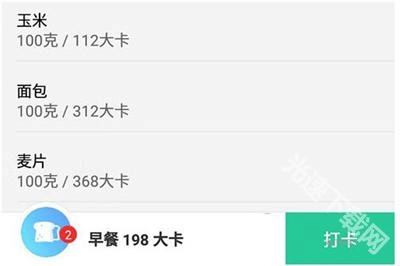 用户可以从某一餐开始记录饮食,自行选择摄入食物的重量或数量,软件会自动将其换算为卡路里数据,添加完成后点击右下角的打卡按钮即可。