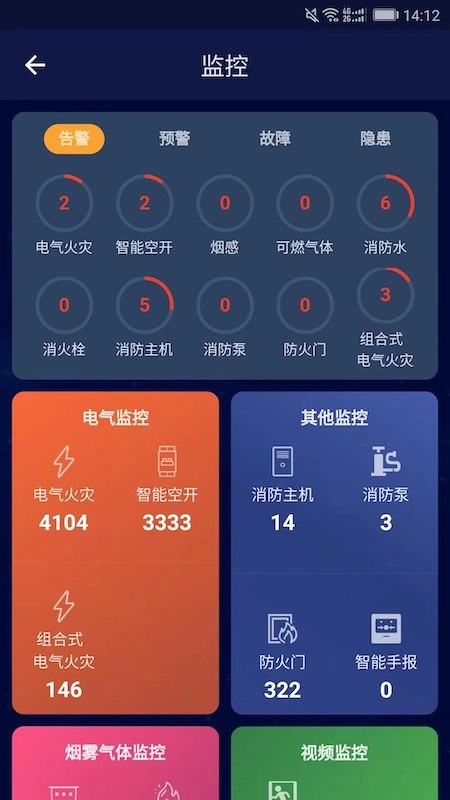 智能消防监测系统,火警感应器主动上报触发,实时统计