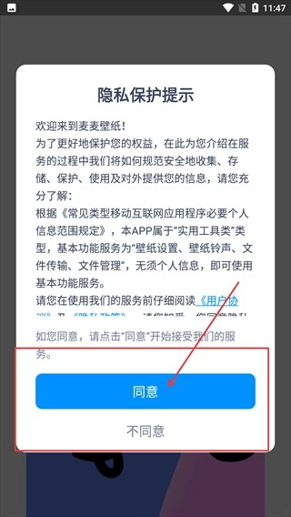 打开麦麦壁纸后,会弹出【隐私保护提示】,点击【同意】,即可进入软件主界面。