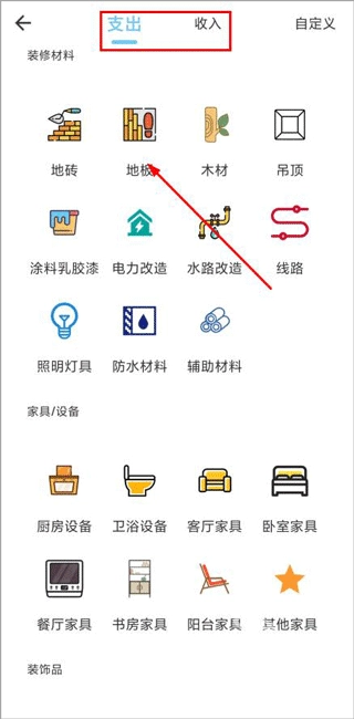 记账页面分为指出和收入,选择支出页面的材料类别;