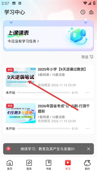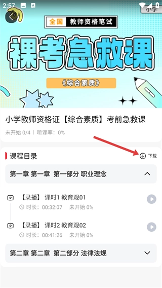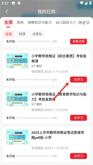 进入我的已购页面,找到对应的课程(比如【小学教师资格证-综合素质-考前急救课】),点击【去学习】按钮就能进入课程界面啦。