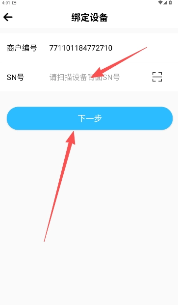 扫描您所购买的POS设备背面的SN号,完成后点击“下一步”。