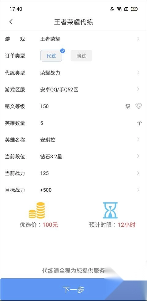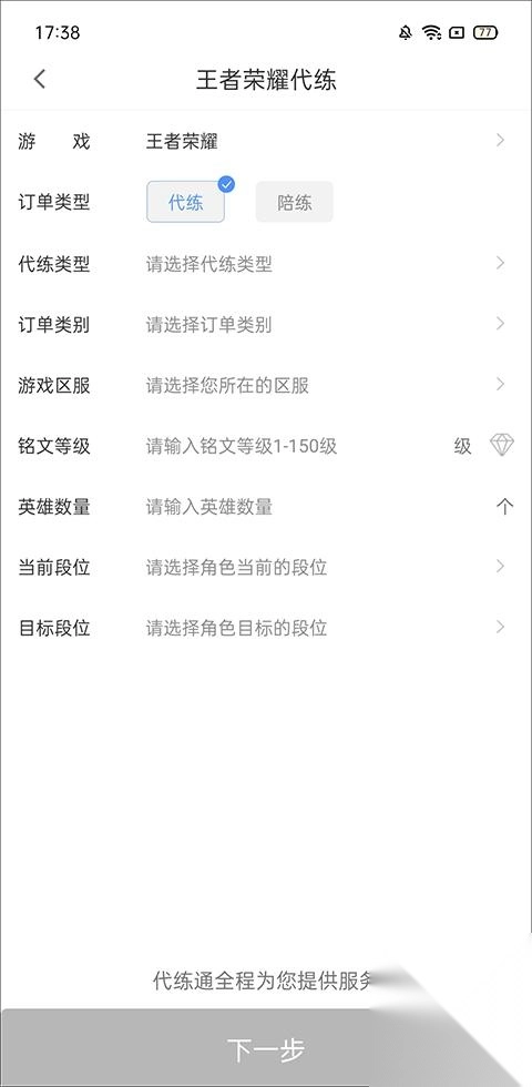 在这里填写代练相关的订单信息,包括代练类型、游戏区服、铭文等级、拥有的英雄数量以及当前所处的段位等内容。