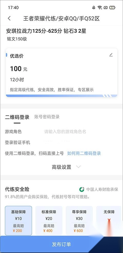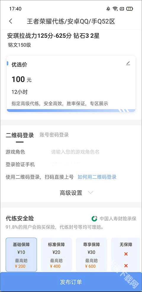 最后输入账号相关信息,包括您的游戏角色名、验证号码等内容,接着点击发布订单就可以了。