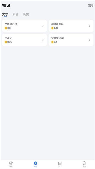 点击“知识”一栏,还能提前了解文学、科普、历史等相关知识。
