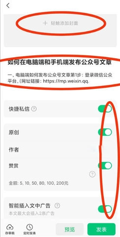 添加封面、标题、摘要、设置广告、原创声明、作者、等,最后点击右下角发表,完成文章发布。