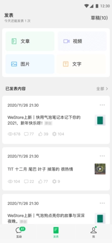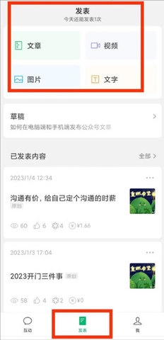 登录成功后,在首页的最底部点击【发表】按钮,进入【发表】页面后,再点击“文章”选项。