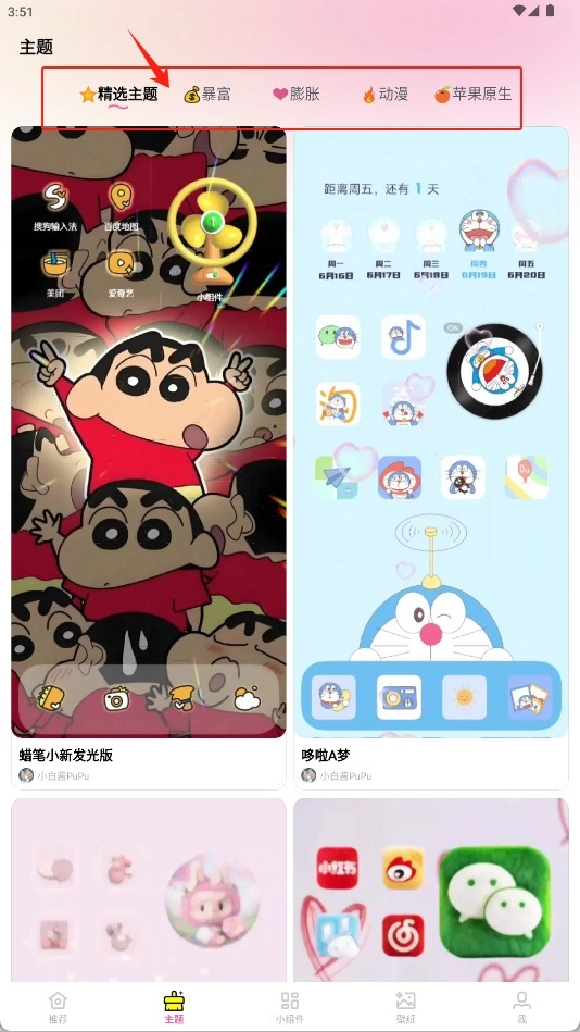 进入主题页面后,挑选自己喜爱的主题动画图片,或是选择最新推荐的精选主题壁纸。