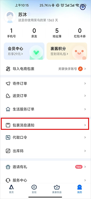 打开我的之后,点击包裹消息通知