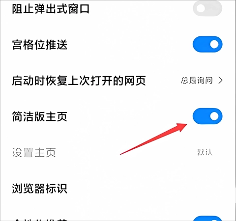 找到“简洁版主页”选项,把它右边的开关打开,重启浏览器就能生效了。