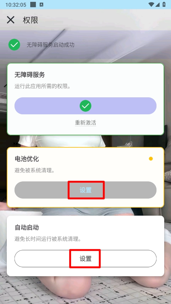 回到主页后,在权限设置页面一次性完成电池优化和自动启动的配置就可以了。