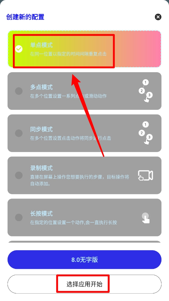 如图所示,先选择点击模式,这里以单击点击为例,接着挑选需要进行点击操作的应用。