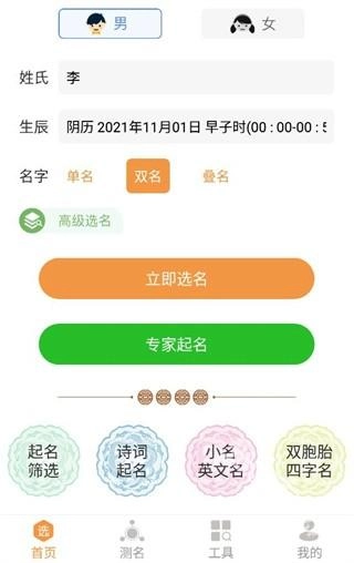 找名字,可以输入姓氏和性别,快速找到合适的名字;