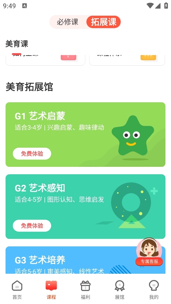 请向下滑动页面找到美育拓展馆,依据学员的实际情况挑选相应的级别,选定级别后,直接在该级别对应的课程列表页面完成兑换操作。