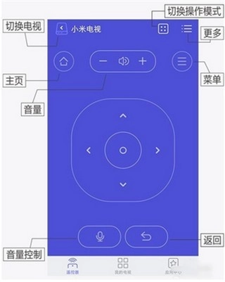 下面这段文本修改后为: 以小米电视为例,点击进入其主界面,设计简洁明了。界面上分布着常用的选择键、确定键、菜单键、主页键、返回键和音量键,下方设有功能选择栏,右上方则有切换手势遥控器和更多设置两个按钮。