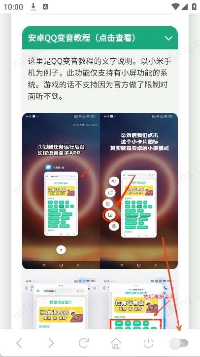 小团团语音盒软件具备悬浮窗功能,在获取相应权限后,该悬浮窗就能显示于手机桌面的最顶层,便于用户随时开启或切换语音包。此外,这款软件还搭载了变声功能,对于不清楚如何操作变声的用户,可以参考软件的详细教程来逐步学习!