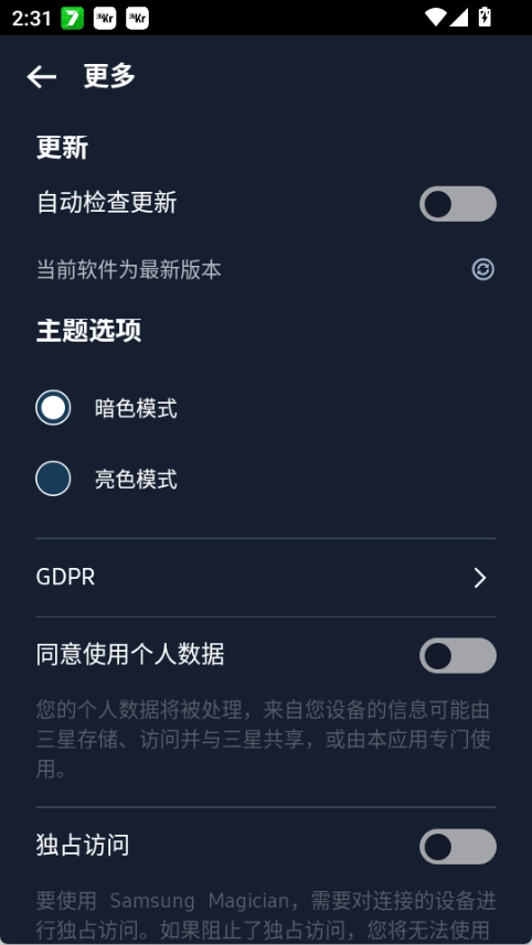 三星魔术师也就是Samsung Magician,是三星品牌推出的固态硬盘管理工具。首次使用时,它会询问用户是否为欧洲国家或地区的居民。当三星魔术师Samsung Magician与SSD连接后,就能对SSD开展管理工作,比如查看容量、温度,以及进行密码管理等操作。无需借助电脑,用户在手机上就能随时查看硬盘状态、修改密码和升级固件。目前,该工具支持便携式SSD T7系列产品。
