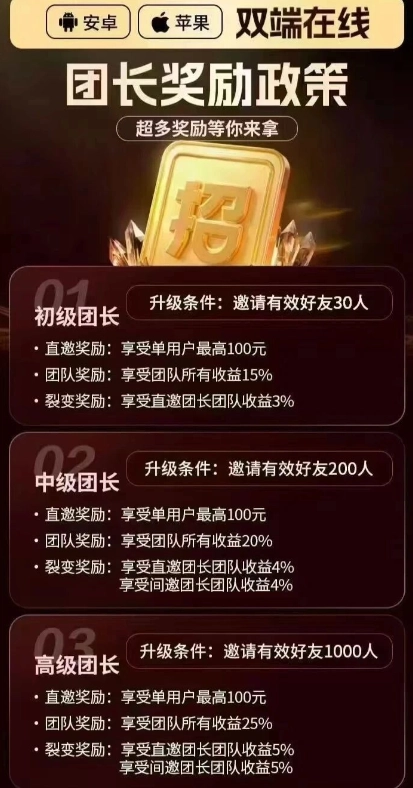 直邀奖励:可获得单用户最高100元的奖励;团队奖励:能享受团队全部收益的15%;裂变奖励:可享有直邀团长团队收益的3%。