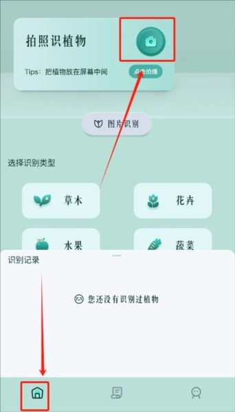 打开小黄养花APP进入后,首页显眼位置就有拍照按钮,点击即可拍摄植物进行识别。