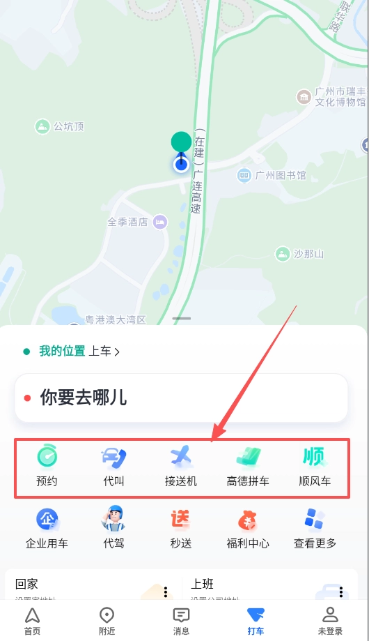 当需要打车时,输入目的地后,系统会同步呈现实时打车、拼车、顺风车等多种出行选项,方便你对比不同选项的价格与接驾时间。