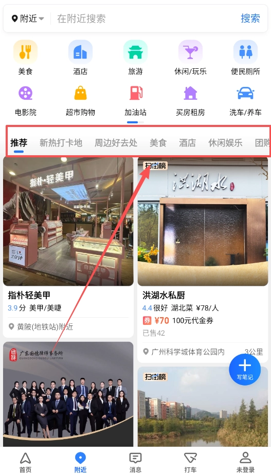 要是想找附近能吃能玩的地方,不妨点开下方的“附近”页签,这里头美食、酒店、加油站等各类信息都划分得清清楚楚,直接点进对应分类就能查看具体列表和距离远近,用起来特别省心。