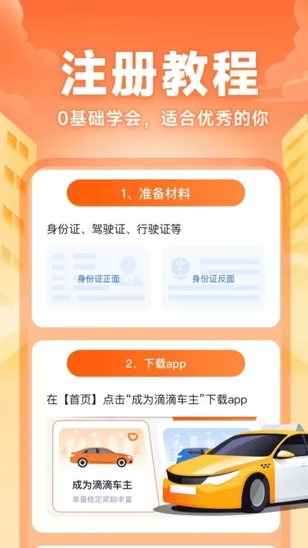 整合市面上主流的快车平台,详细的注册步骤,帮助司机快速完成注册,大大节省注册时间与精力,快速开启接单之旅。
