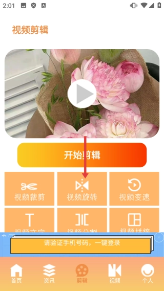 在视频剪辑页面,点击【视频旋转】按钮,即可进入视频选择界面。