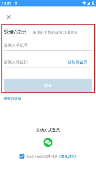 输入手机号、验证码后,点击登录,完成登录操作。