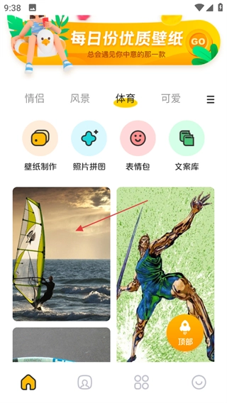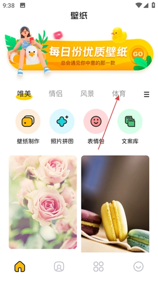 在壁纸页面,点击体育标签,切换到体育类壁纸。