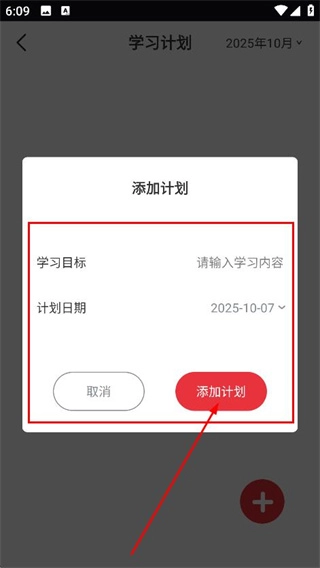 在学习计划页面,填写好学习目标等相关信息后,点击添加计划按钮,即可完成学习计划的添加操作。