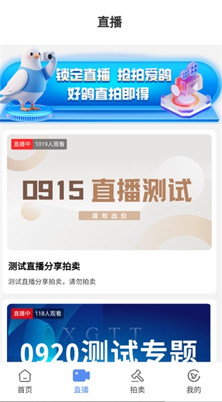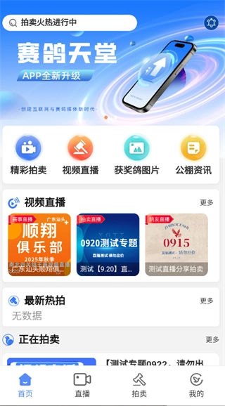 在首页就能看到精彩拍卖、视频直播、获奖鸽图片等功能板块。