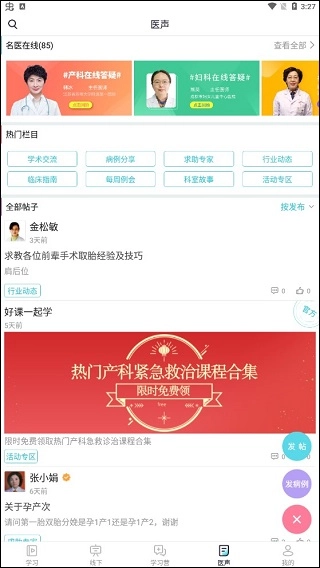 除了线上教学课程与线下实操培训,医声平台还具备社区动态般的社交功能。在这里,您既能发帖寻求名师指导,也可分享病例;通过社区动态的交流互动,既能丰富自身学识,又能拓展学习途径,更有众多热门栏目可供开展针对性训练!
